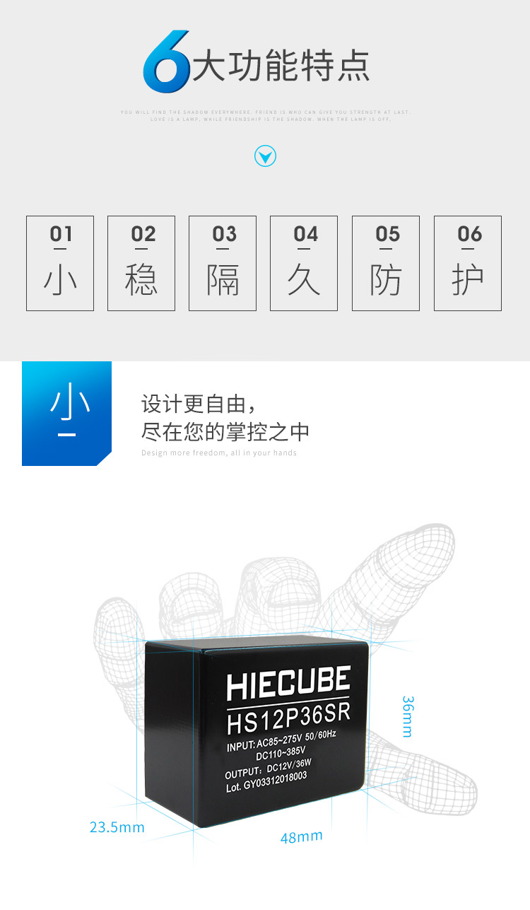 品牌:hiecube(高能立方) 型号:hs12p36sr 隔离耐压:3000vac 输出电压精度:±1% 电源类别:工业级acdc电源模块 模块质保年限:3年